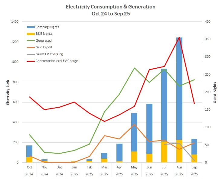 We take full accountability for our environmental impact by tracking the carbon footprint of our entire site through the Green Business Carbon Tracker. Wray Valley is both our home and our business. We live here year-round, which means our winter energy usage is primarily personal heating, while our summer usage is driven by guest demand for hot water. Because our systems are integrated, we do not attempt to “split” our personal lives from the B&B and campsite. Instead, we report on the total net impact of the entire 10-acre site. We believe this “whole-household” approach is the most honest way to show how we manage our footprint.