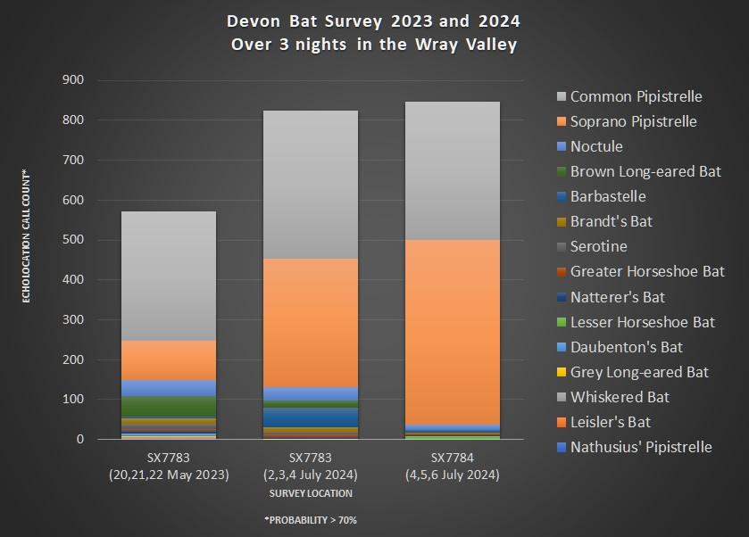Despite the bad weather there were many more bat echolocation calls recorded in July 2024 in both locations than in May 2023. Baby bats are typically born in June and can fly at 3 weeks old.